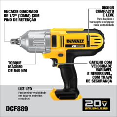 Chave de Impacto 1/2 Pol. 20V Max Íon-Lítio com 2 Bat. 4,0 Ah Maleta e Carregador - DEWALT-DCF889M2